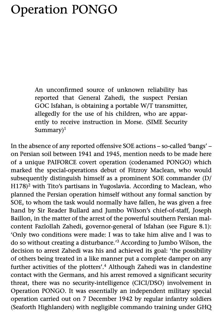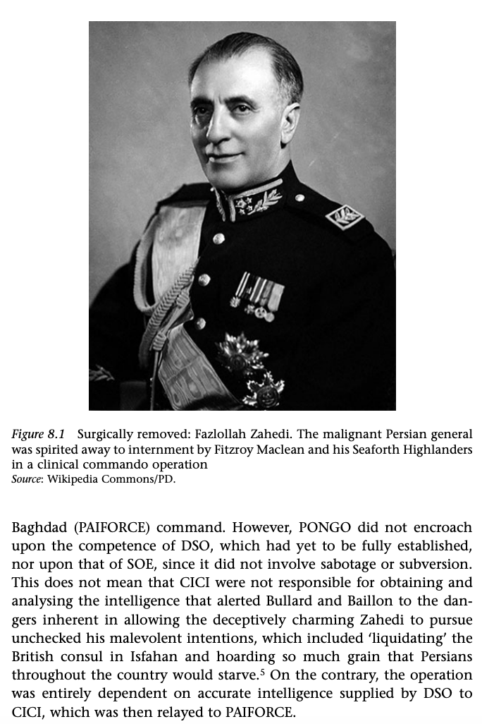 I was recently shown a copy of fitzroy maclean where he details the riad he conducted where he and the british military kidnapped, Fazlollah Zahedi, then Sepahbod, and imprisoned him in Palestine, for his association with nazi Germany, in a blackop called operation pongo